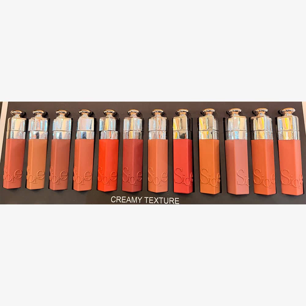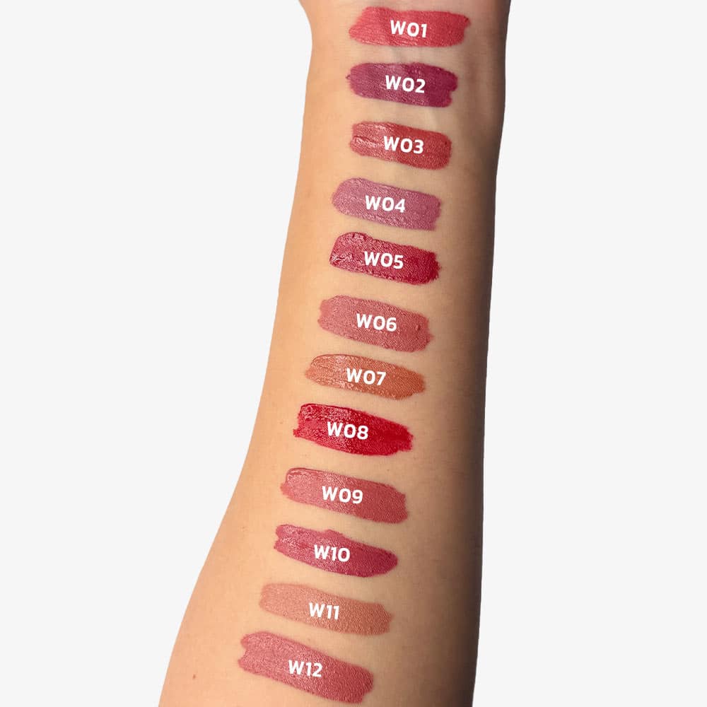 رژلب سیوره مات در ۱۲ رنگ (W01 تا W12): از نود روزانه (W01-W04)، صورتی ملایم (W05-W08) تا قرمز و قهوهای پررنگ (W09-W12) – رنگهایی که با پوستهای ایرانی عالی ست میشوند.