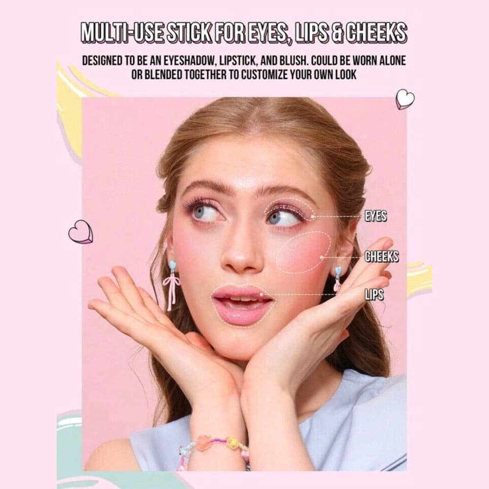 2. اعمال رژگونه: استیک را مستقیماً روی گونه‌ها یا لب‌ها بکشید (شماره ۱۲ برای جلوه صورتی ملایم، شماره ۱۳ برای رنگ هلویی گرم).
