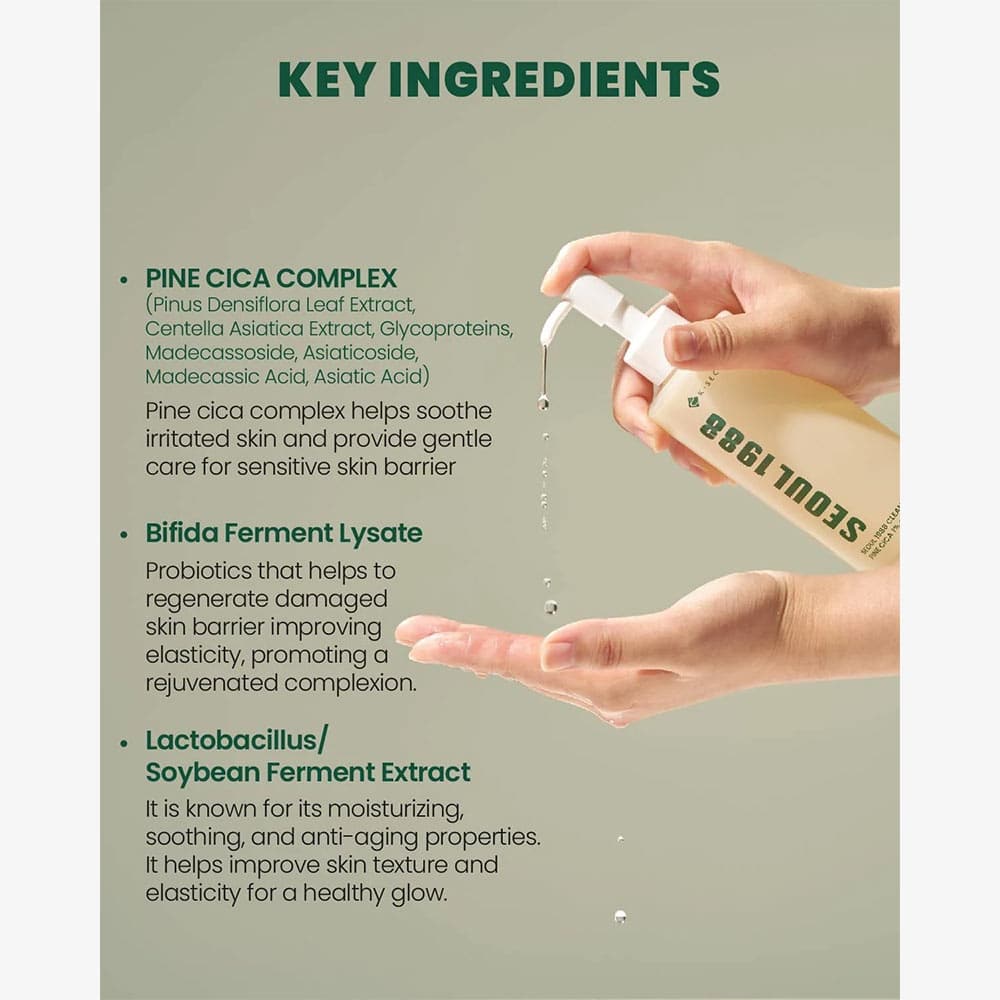 شوینده وگان کی سکرت حاوی ۱٪ کمپلکس پاین سیکا (عصاره کاج و سنتلا آسیاتیکا) است که التهابات پوستی را تسکین داده و سد دفاعی پوست را تقویت میکند. مدیکاسوساید و اسید آسیاتیک نیز به ترمیم پوست حساس و کاهش قرمزی کمک میکنند.
