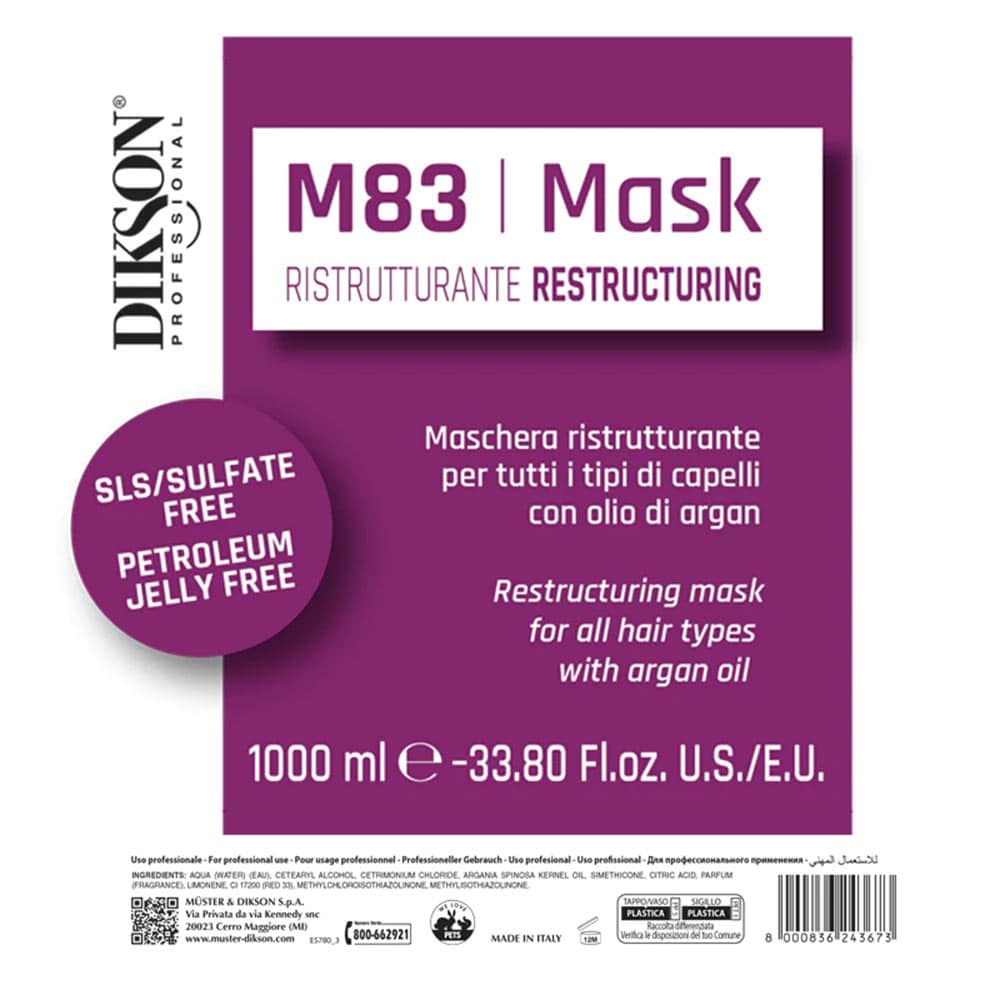 ماسک مو m83 دیکسون، تولیدشده توسط برند ایتالیایی Dikson با سابقه‌ای طولانی در مراقبت مو، با استانداردهای بالای زیبایی و بدون تست حیوانی عرضه می‌شود. با حجم ۱۰۰۰ میلی‌لیتر و انقضای ۱۲ ماه پس از باز شدن، این محصول کیفیت و دوام بالایی را تضمین می‌کند.