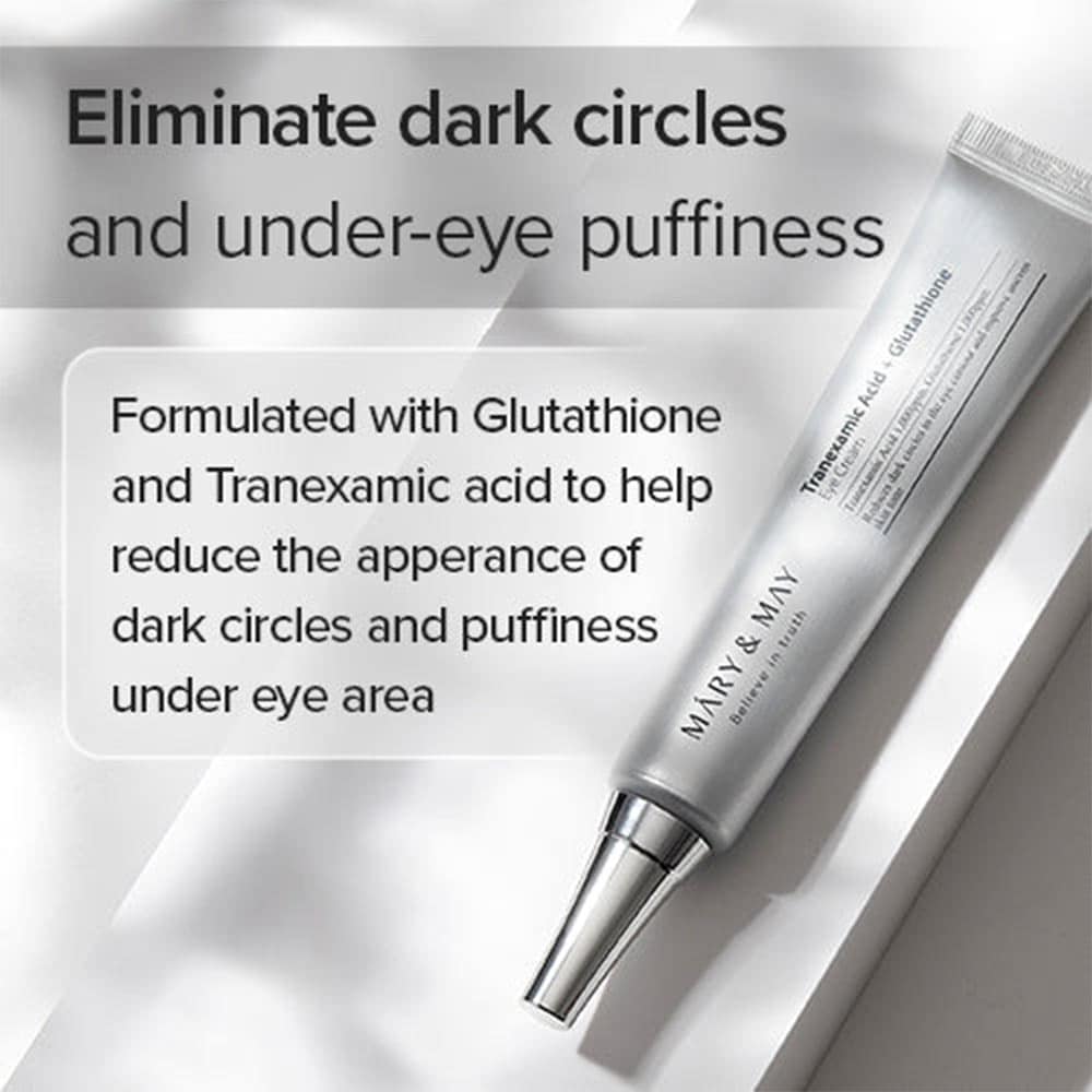 کرم دور چشم ترانگزامیک اسید مری اند می با ۱۰۰۰ ppm ترانگزامیک اسید و گلوتاتیون، تولید ملانین را مهار کرده و تیرگی و لکهای اطراف چشم را بهمرور کاهش میدهد. این ترکیبات، پوست را روشنتر کرده و به احیای پوستهای کدر کمک میکنند.